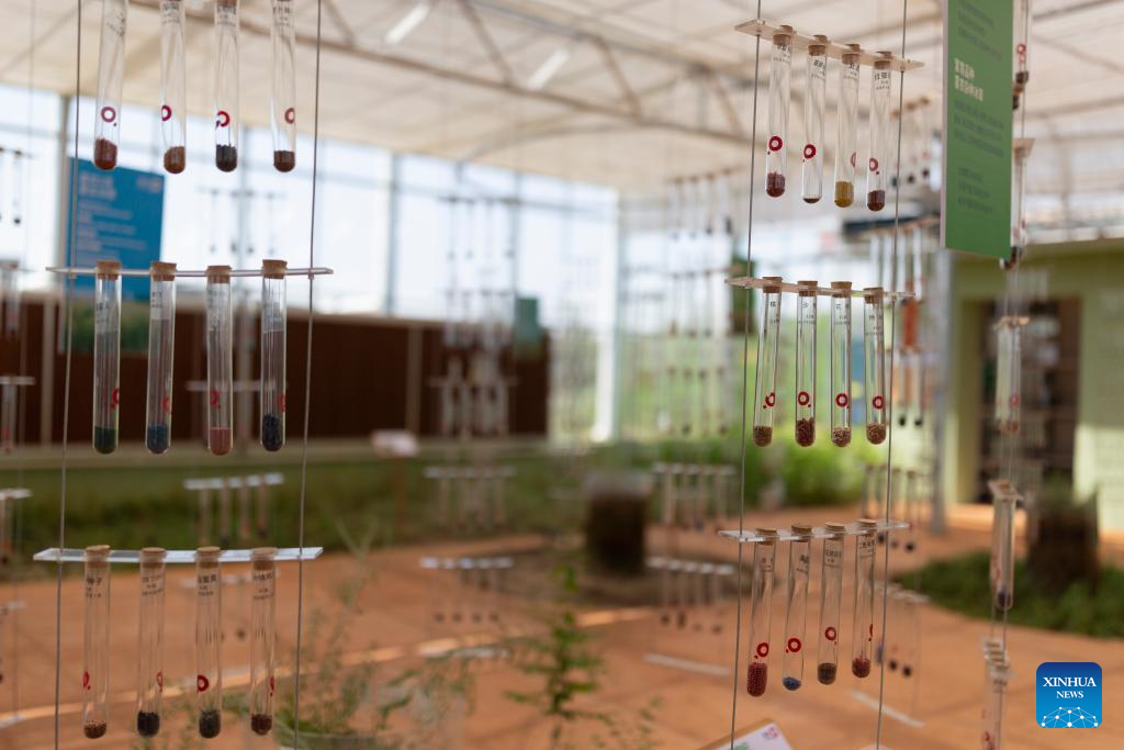 A staff member introduces desert plant specimens at an integrated sand control and photovoltaic project at a state forestry area in the edge of Ulan Buh Desert in Linhe District of Bayannur, north China's Inner Mongolia Autonomous Region, June 5, 2025. In recent years, Inner Mongolia has made all-out efforts to tackle the ecological challenges in the areas along the Yellow River, and has treated land covering a total of 14.89 million mu (about 992,667 hectares).