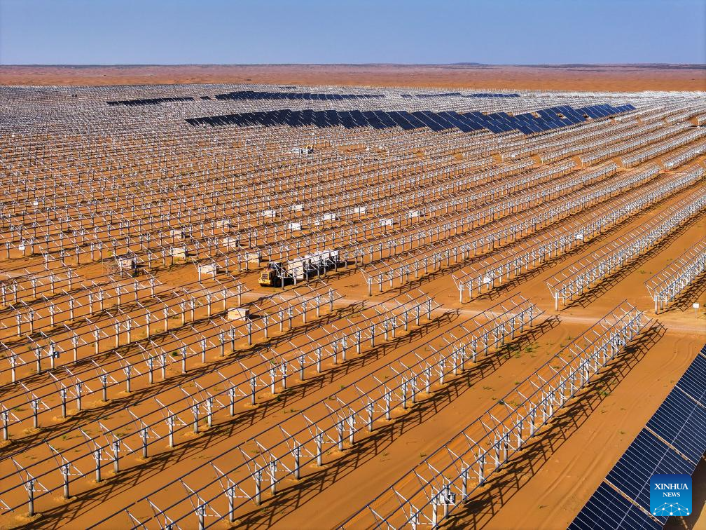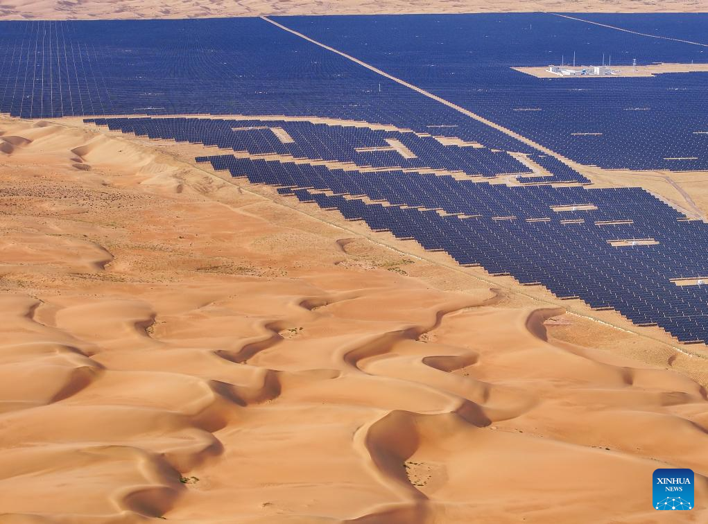 In deserts of Kubuqi and Ulan Buh, the sand control model with photovoltaic projects has been widely implemented, transforming stretches of sandy terrain into vast "blue seas" brimming with green energy. (Xinhua/Lian Zhen)