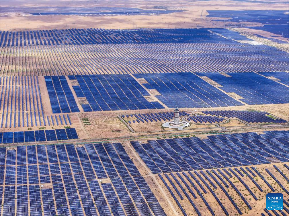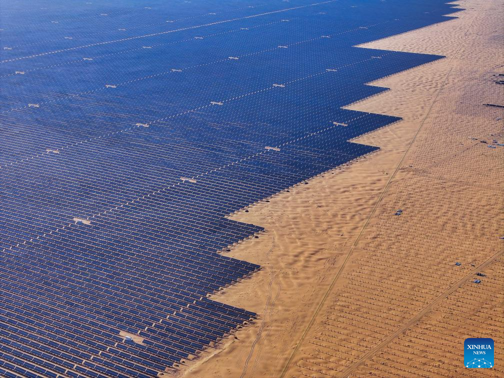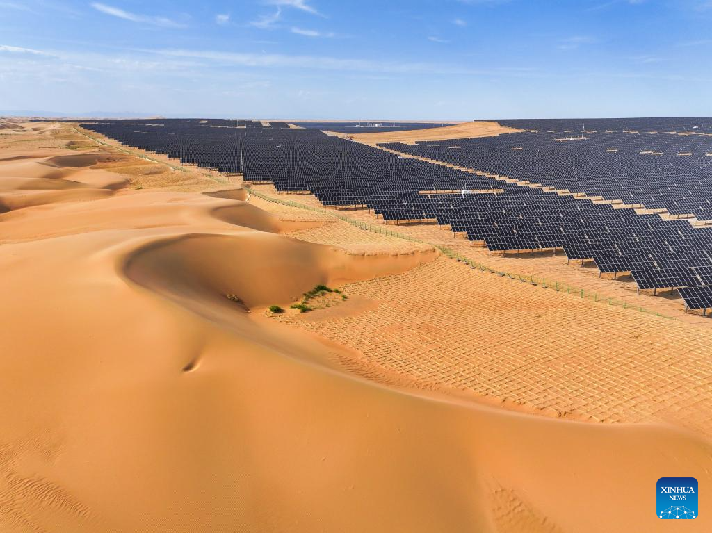 In deserts of Kubuqi and Ulan Buh, the sand control model with photovoltaic projects has been widely implemented, transforming stretches of sandy terrain into vast "blue seas" brimming with green energy. (Xinhua/Gao Wei)