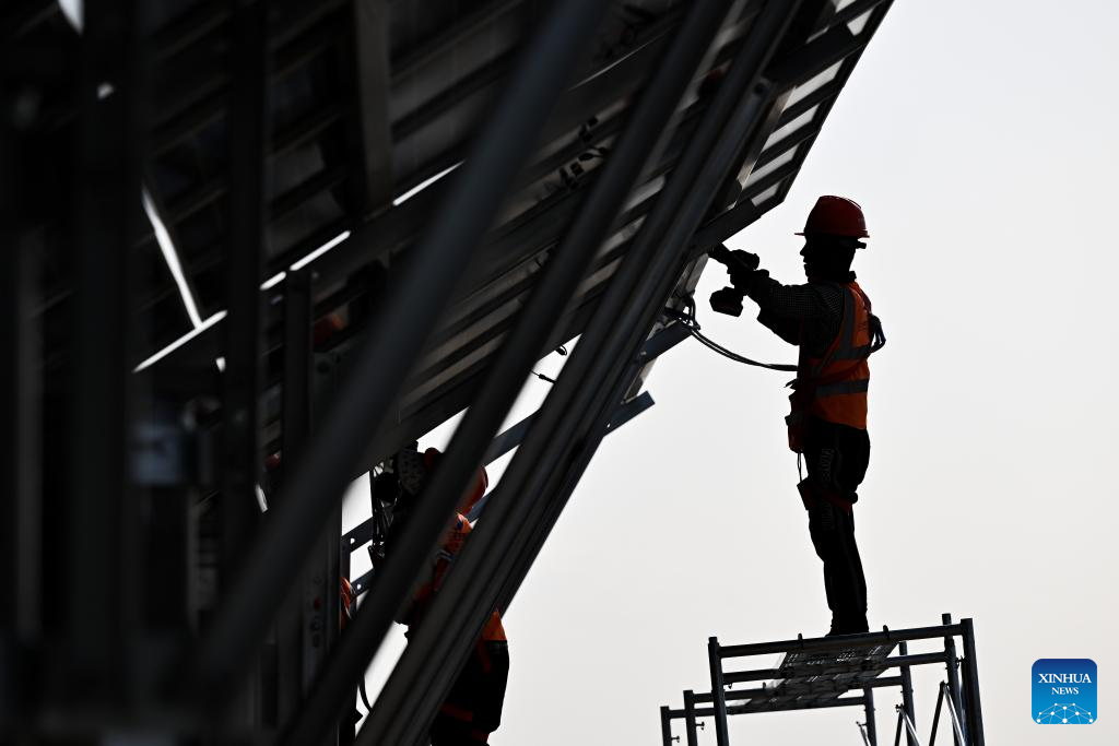 A worker installs photovoltaic panels at a photovoltaic project in Kubuqi Desert, north China's Inner Mongolia Autonomous Region, June 6, 2025. In recent years, Inner Mongolia has made all-out efforts to tackle the ecological challenges in the areas along the Yellow River, and has treated land covering a total of 14.89 million mu (about 992,667 hectares).