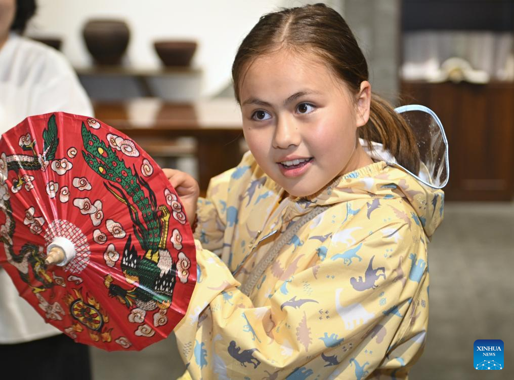 Burak Anbar's daughter shows an oil-paper umbrella, a national-level intangible cultural heritage, in Hejiang County, Luzhou City, southwest China's Sichuan Province, May 28, 2025. (Xinhua/Liu Kun)