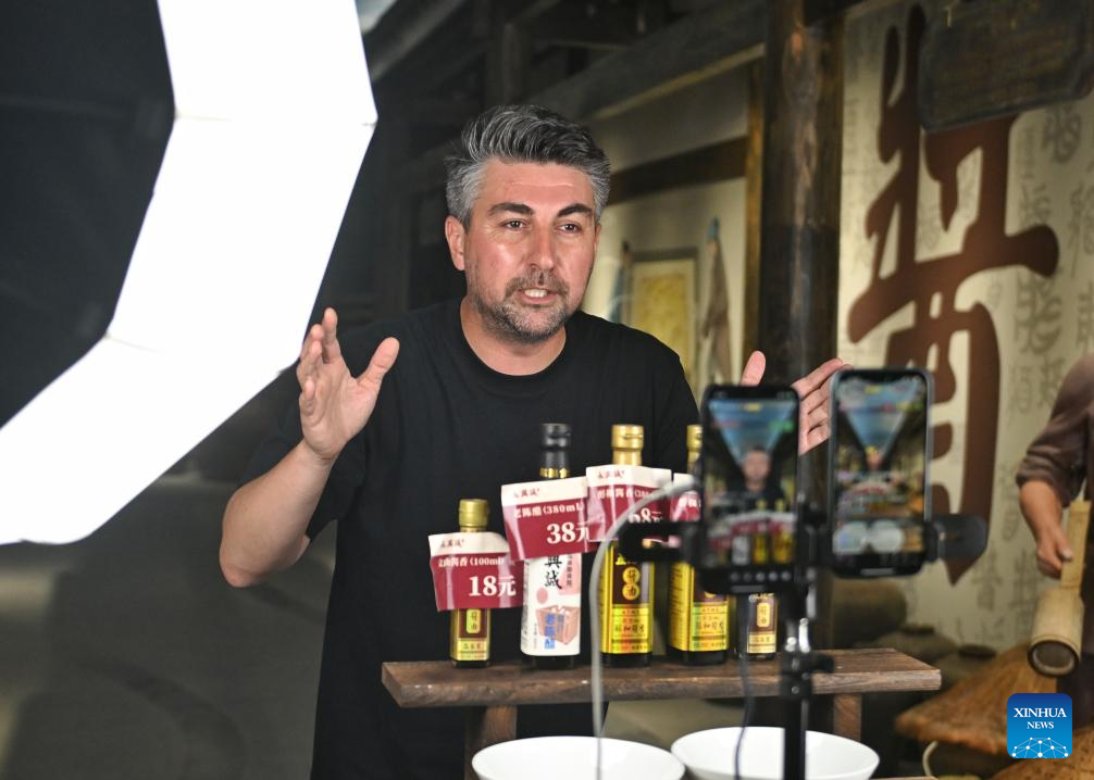 Burak Anbar promotes local made soy sauce via live-streaming at a soy sauce factory in Hejiang County, Luzhou City, southwest China's Sichuan Province, May 28, 2025. (Xinhua/Liu Kun)