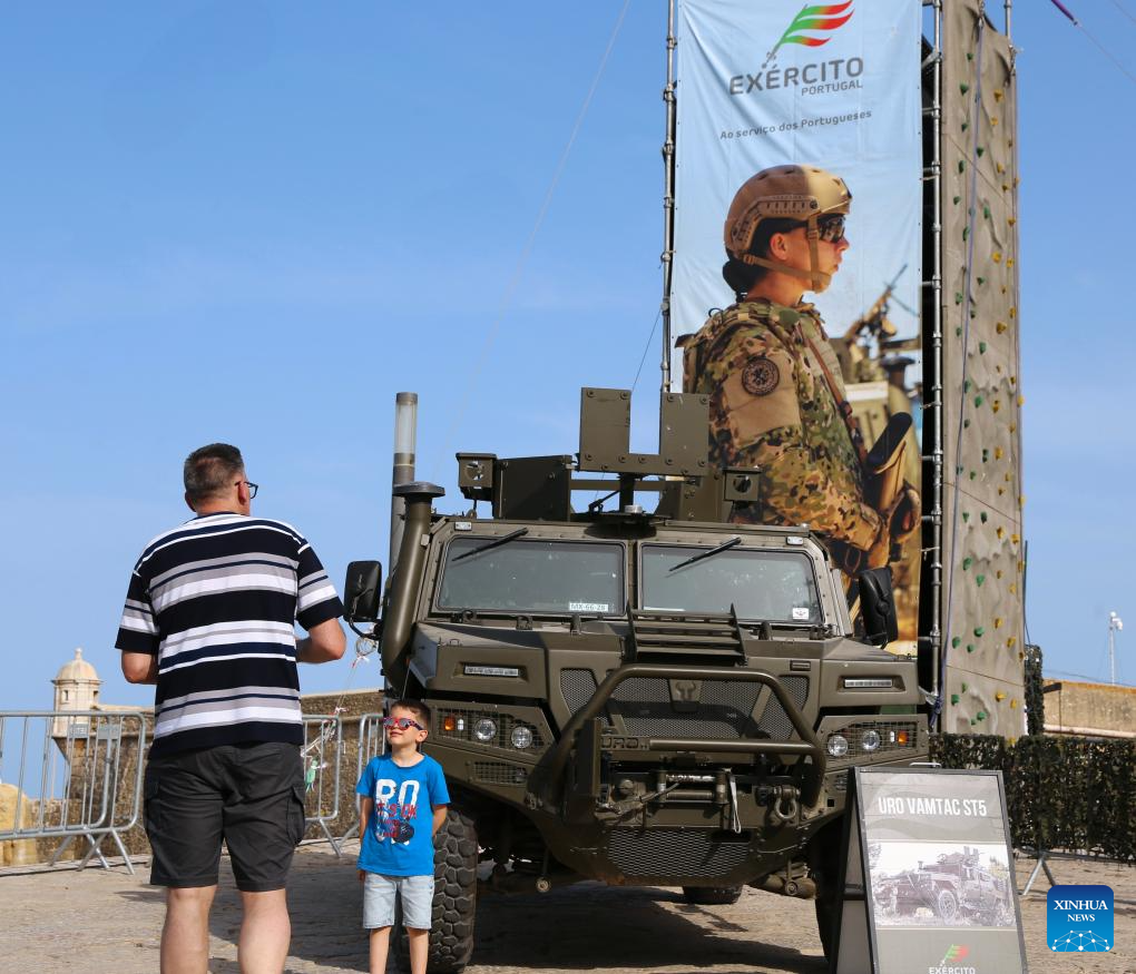 A boy takes a photo with a military vehicle in Lagos, Portugal, June 8, 2025. Portugal will hold its National Day military parade on June 10 in the southern coastal city of Lagos. On June 8, the armed forces organized an open day event, featuring exhibition booths and inviting the public to interact with soldiers and various types of military equipment. (Xinhua/Xun Wei)