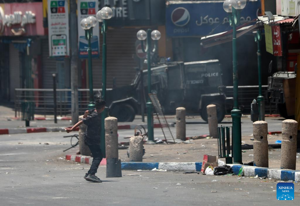 Palestinians throw stones during clashes with Israeli forces in the West Bank city of Nablus, on June 10, 2025. A Palestinian man was killed and another injured on Tuesday during an Israeli army raid in the Old City of Nablus in the northern West Bank, according to a Palestinian official. (Photo by Ayman Nobani/Xinhua)