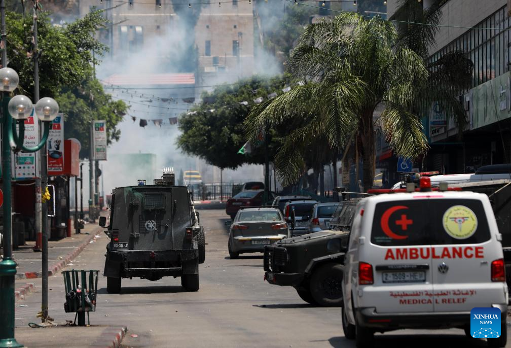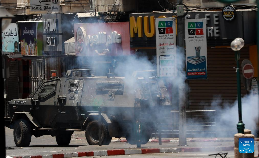 A vehicle of Israeli forces is seen during an operation in the West Bank city of Nablus, on June 10, 2025. A Palestinian man was killed and another injured on Tuesday during an Israeli army raid in the Old City of Nablus in the northern West Bank, according to a Palestinian official. (Photo by Ayman Nobani/Xinhua)