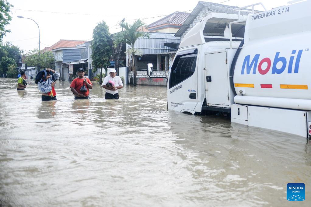 People wade through flood water after heavy rain in Benjeng village of Gresik Regency, East Java, Indonesia, June 10, 2025. (Photo by Sahlan Kurniawan/Xinhua)