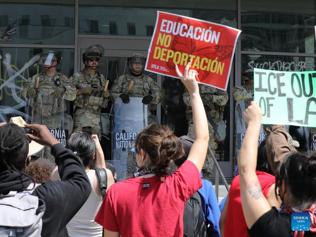 LOS ANGELES, June 10 (Xinhua) -- Thousands of U.S. troops and police were still surrounding small groups of peaceful protesters in downtown Los Angeles by Monday noon, following hours of confrontation. The unprecedented show of military force on American streets comes amid a constitutional crisis between the Trump administration and the state of California over immigration enforcement.