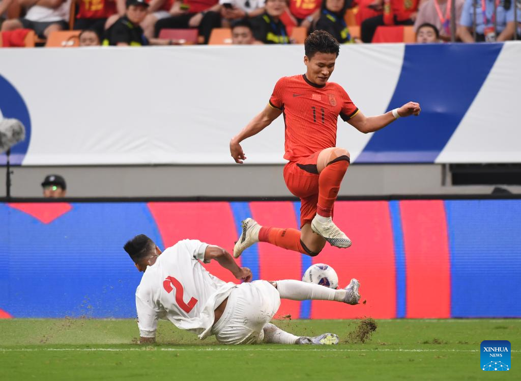 Wang Yudong (front) of China reacts during the 2026 FIFA World Cup Asian Qualifiers Group C match between China and Bahrain in Chongqing, southwest China, June 10, 2025. (Xinhua/Chen Cheng)