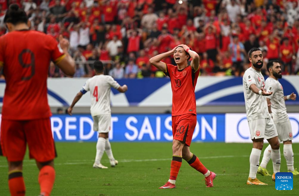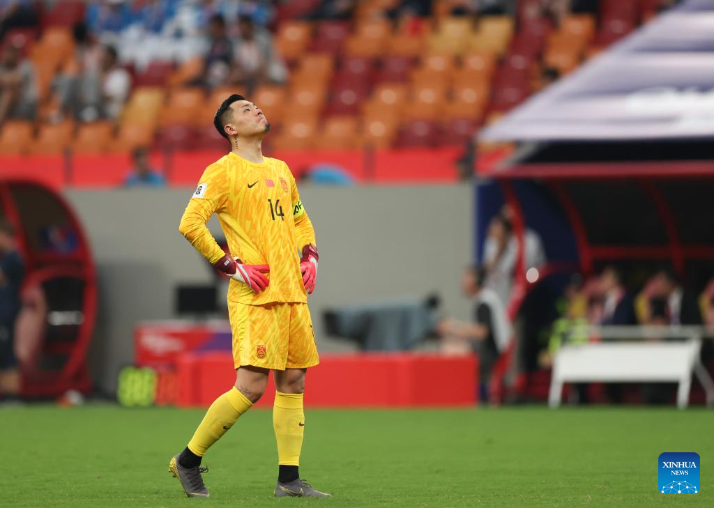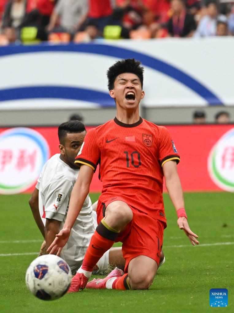 Wang Yudong (C) of China reacts during the 2026 FIFA World Cup Asian Qualifiers Group C match between China and Bahrain in Chongqing, southwest China, June 10, 2025. (Xinhua/Chen Cheng)