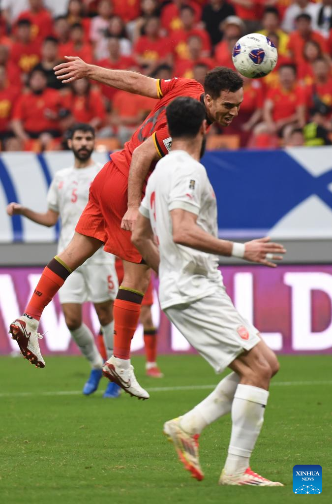 Sai Erjiniao (C) of China heads the ball during the 2026 FIFA World Cup Asian Qualifiers Group C match between China and Bahrain in Chongqing, southwest China, June 10, 2025. (Xinhua/Chen Cheng)
