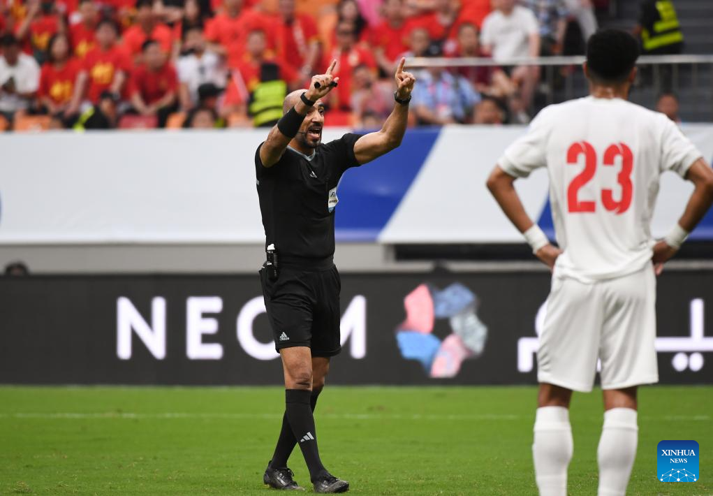 Referee Adel Ali Alnaqbi gestures during the 2026 FIFA World Cup Asian Qualifiers Group C match between China and Bahrain in Chongqing, southwest China, June 10, 2025. (Xinhua/Chen Cheng)