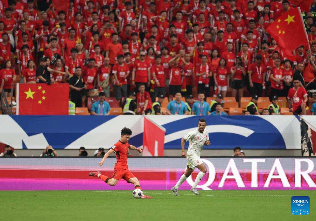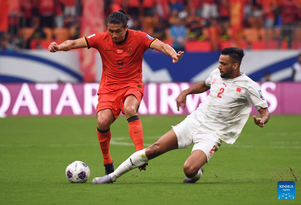Zhang Yuning (L) of China kicks the ball during the 2026 FIFA World Cup Asian Qualifiers Group C match between China and Bahrain in Chongqing, southwest China, June 10, 2025. (Xinhua/Chen Cheng)