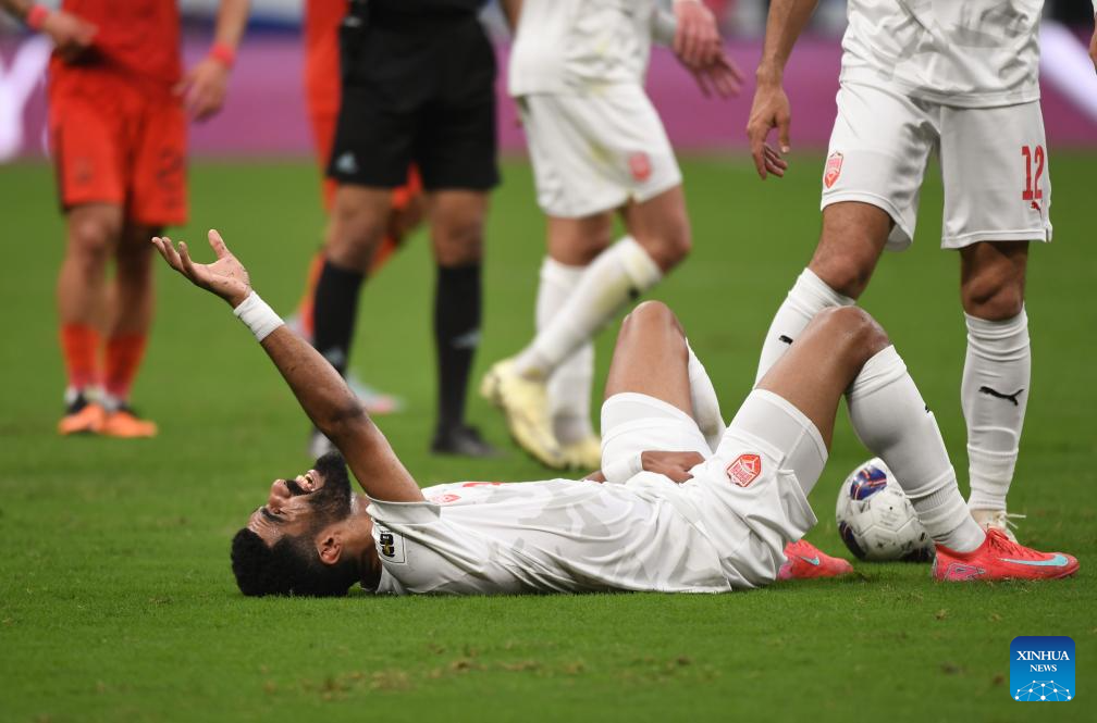 Waleed Alhayam of Bahrain reacts after getting injured during the 2026 FIFA World Cup Asian Qualifiers Group C match between China and Bahrain in Chongqing, southwest China, June 10, 2025. (Xinhua/Chen Cheng)