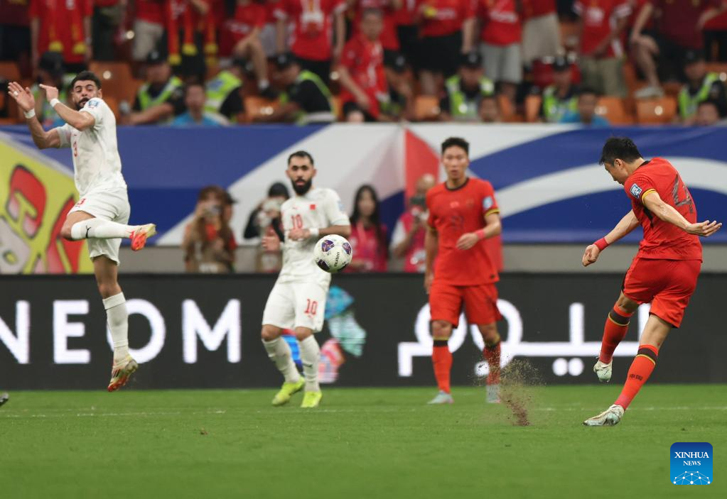 Li Lei (1st R) of China shoots during the 2026 FIFA World Cup Asian Qualifiers Group C match between China and Bahrain in Chongqing, southwest China, June 10, 2025. (Xinhua/Huang Wei)