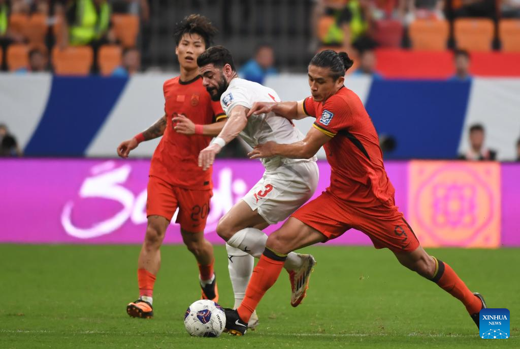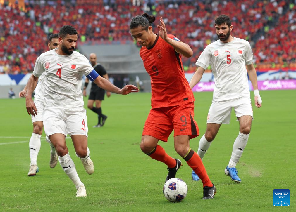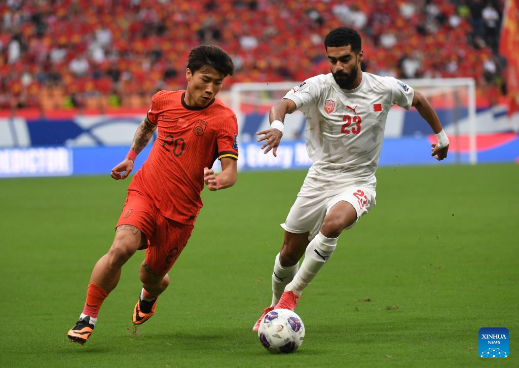 Lin Liangming (C) of China vies with Hamad Alshamsan of Bahrain during the 2026 FIFA World Cup Asian Qualifiers Group C match in Chongqing, southwest China, June 10, 2025. (Xinhua/Huang Wei)