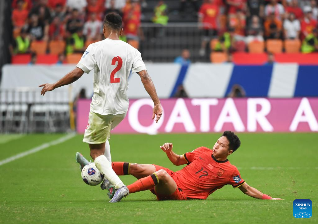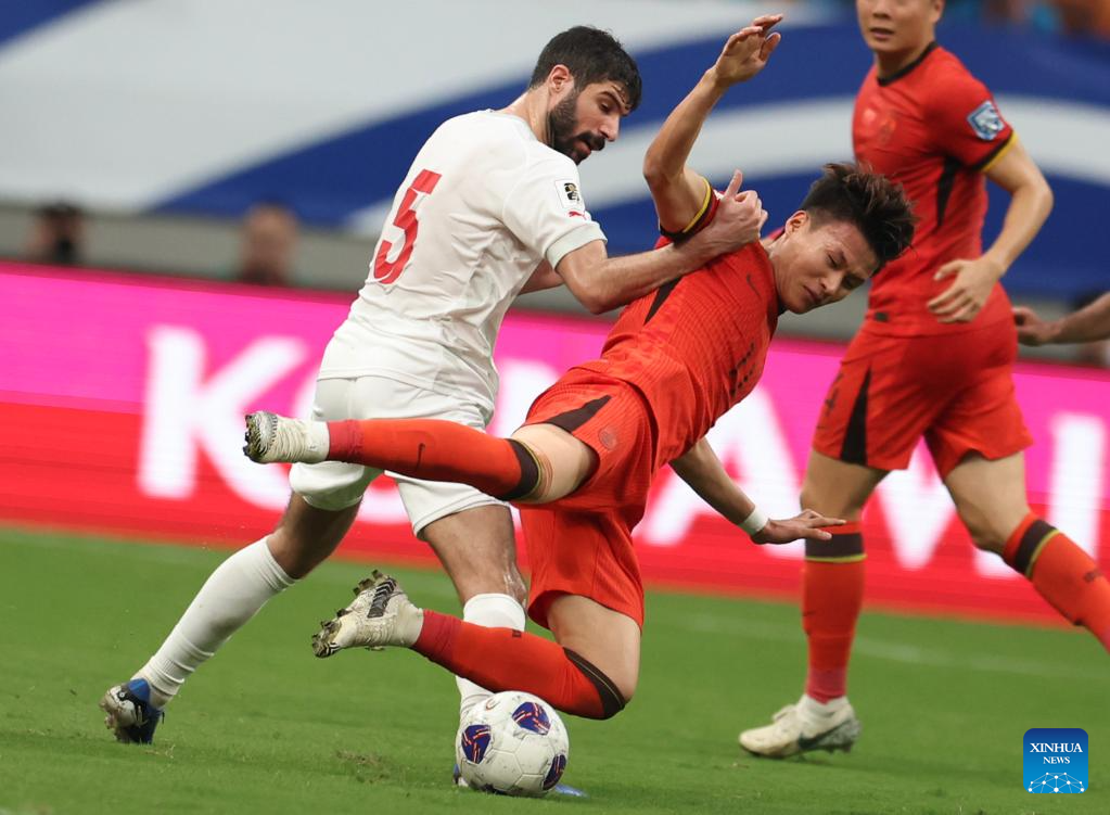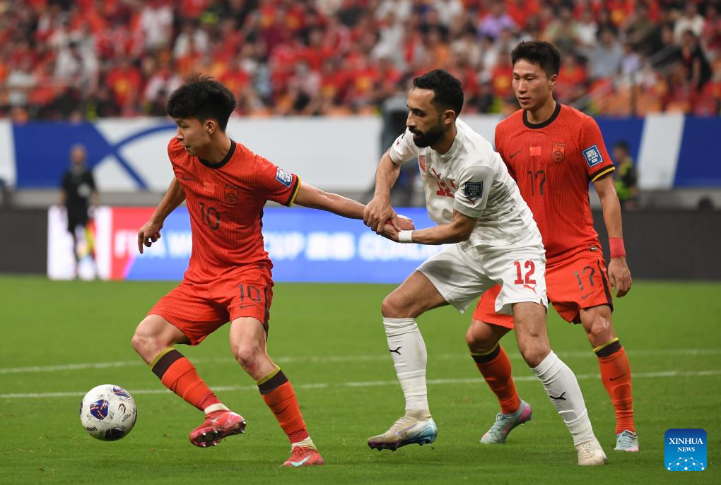 Wang Yudong (L) of China competes during the 2026 FIFA World Cup Asian Qualifiers Group C match between China and Bahrain in Chongqing, southwest China, June 10, 2025. (Xinhua/Huang Wei)