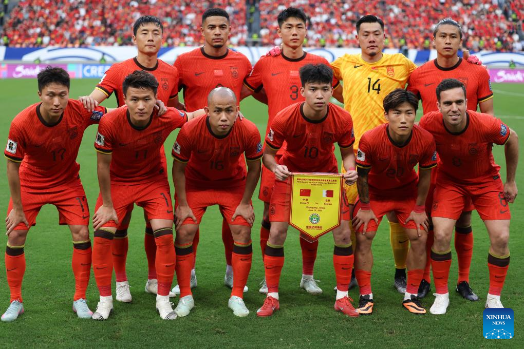 Starting players of China pose for a group photo before the 2026 FIFA World Cup Asian Qualifiers Group C match between China and Bahrain in Chongqing, southwest China, June 10, 2025. (Xinhua/Hu Xingyu)