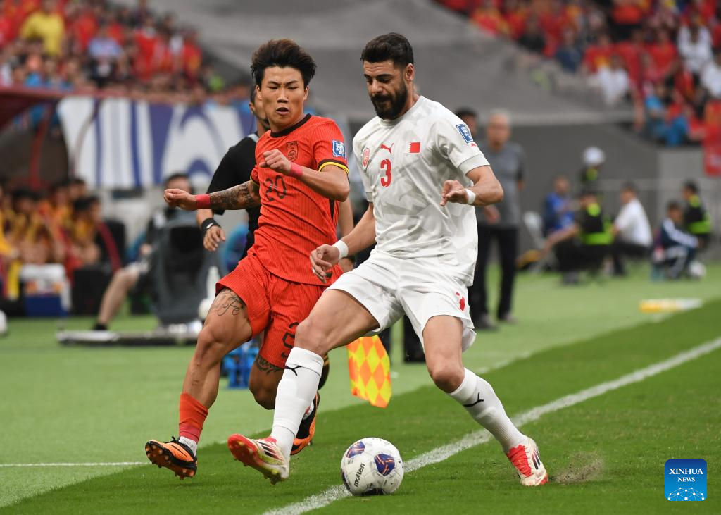 Zhang Yuning (L) of China vies with Amine Benaddi of Bahrain during the 2026 FIFA World Cup Asian Qualifiers Group C match in Chongqing, southwest China, June 10, 2025. (Xinhua/Chen Cheng)