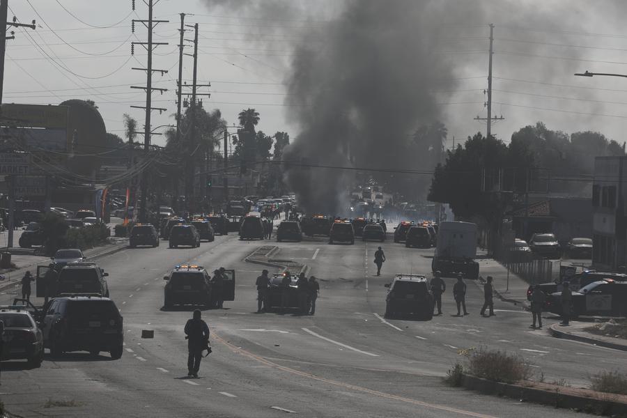 LOS ANGELES, June 10 (Xinhua) -- Thousands of U.S. troops and police were still surrounding small groups of peaceful protesters in downtown Los Angeles by Monday noon, following hours of confrontation. The unprecedented show of military force on American streets comes amid a constitutional crisis between the Trump administration and the state of California over immigration enforcement.