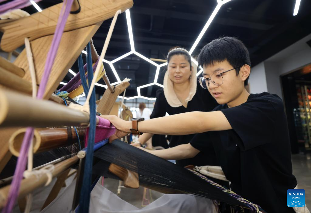 A college student (front) tries to weave Tujia ethnic tapestry during a study tour at a cultural and creative park in Zhangjiajie, central China's Hunan Province, June 9, 2025. As the Cultural and Natural Heritage Day is upcoming, Zhangjiajie City of Hunan Province has developed a touring route themed on intangible cultural heritage, so as to enrich local tourism while protecting and inheriting folk handicrafts. (Photo by Wu Yongbing/Xinhua)