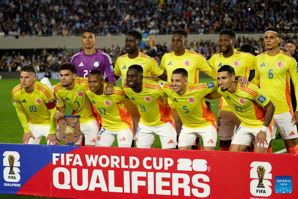 Colombia's starting lineup poses for a group photo prior to the 2026 FIFA World Cup CONMEBOL Qualifier football match between Argentina and Colombia in Buenos Aires, Argentina, June 10, 2025. (Xinhua/Meng Dingbo)
