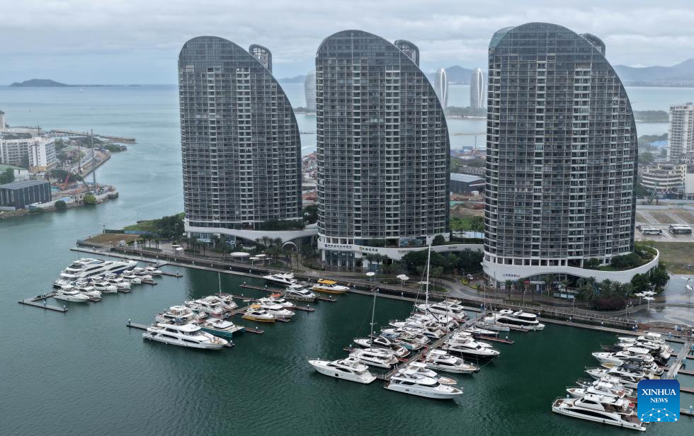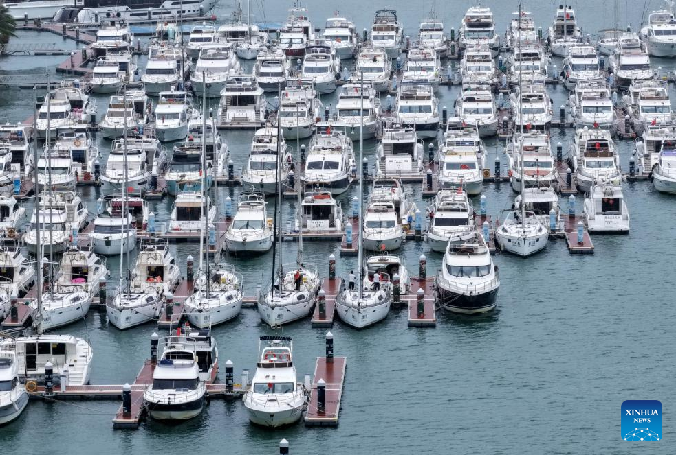 Yachts are seen docked at a dock in Sanya, south China's Hainan Province, June 12, 2025. Affected by Typhoon Wutip, kindergartens in Sanya, Qionghai, Wanning, and Ledong etc. in south China's Hainan Province have been suspended since June 12. China's southernmost island province of Hainan upgraded the flood control and typhoon emergency response from Level IV to Level III at 2:50 p.m. on Wednesday. (Xinhua/Zhao Yingquan)
