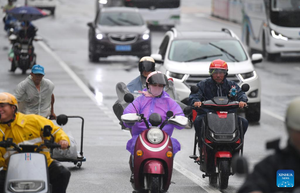 People ride in rain in Jiyang District of Sanya, south China's Hainan Province, June 12, 2025. Affected by Typhoon Wutip, kindergartens in Sanya, Qionghai, Wanning, and Ledong etc. in south China's Hainan Province have been suspended since June 12. China's southernmost island province of Hainan upgraded the flood control and typhoon emergency response from Level IV to Level III at 2:50 p.m. on Wednesday. (Xinhua/Zhao Yingquan)