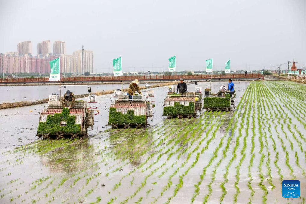 Farmers drive transplanters to transplant rice seedlings at a demonstration farm in Xiqing District of north China's Tianjin, May 25, 2025. (Xinhua)