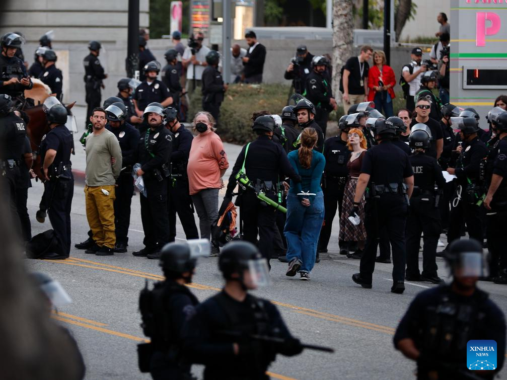 Protesters being arrested are pictured in Los Angeles, the United States, June 11, 2025. Nearly 400 people in immigration protests have been arrested or detained by the Los Angeles Police Department since Saturday, media reports said.