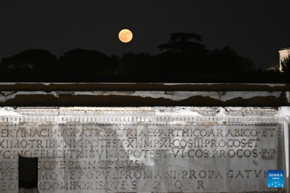 A full moon is pictured with the Imperial Forum in Rome, Italy, on June 11, 2025. (Photo by Alberto Lingria/Xinhua)