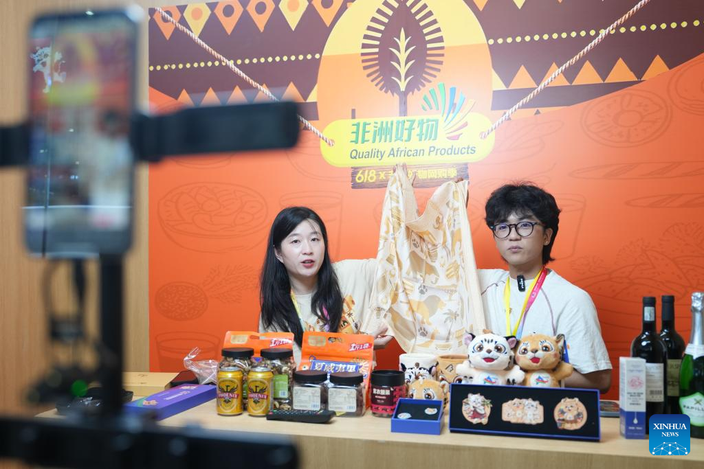 Livestreamers introduce products from Africa at Changsha International Convention and Exhibition Center in Changsha, central China's Hunan Province, June 12, 2025. The fourth China-Africa Economic and Trade Expo opened on Thursday in the central Chinese city of Changsha.