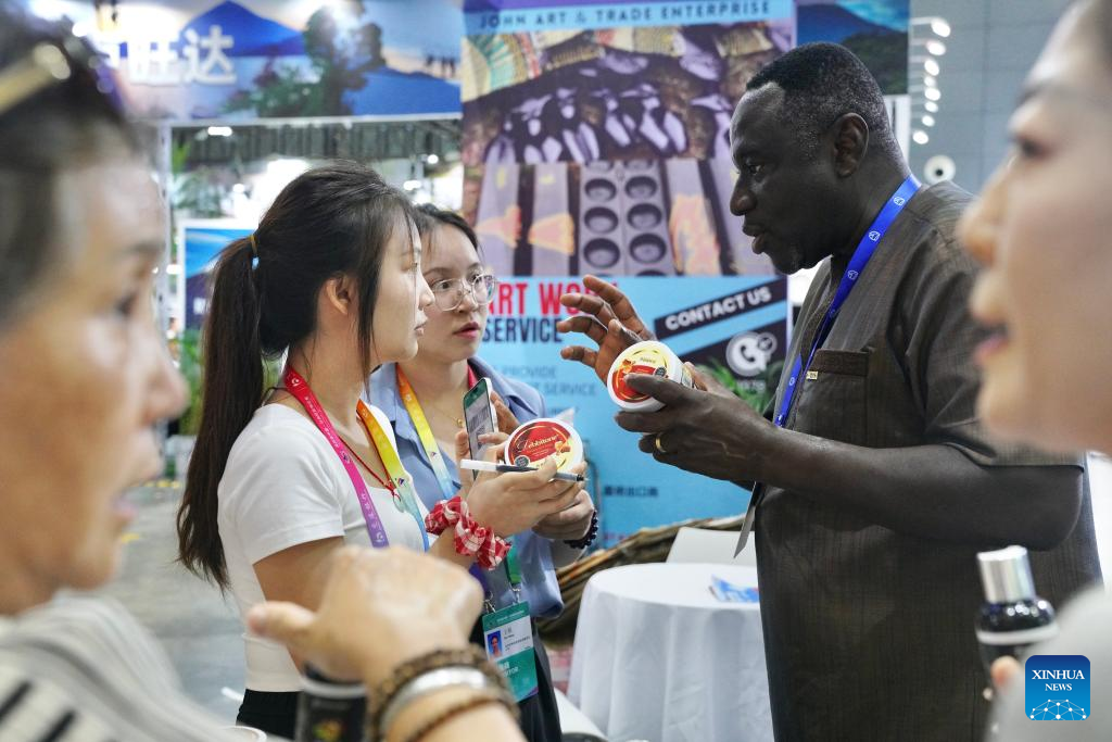 An exhibitor introduces skincare products from Africa at Changsha International Convention and Exhibition Center in Changsha, central China's Hunan Province, June 12, 2025. The fourth China-Africa Economic and Trade Expo opened on Thursday in the central Chinese city of Changsha.
