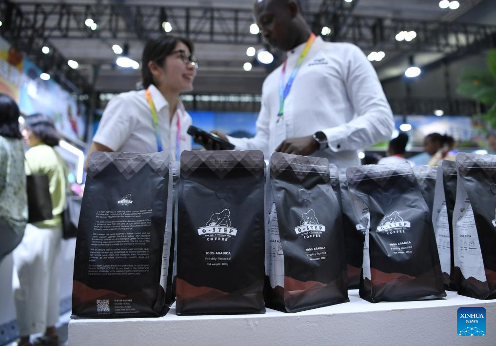 This photo taken on June 12, 2025 shows coffee products from Rwanda at Changsha International Convention and Exhibition Center in Changsha, central China's Hunan Province. The fourth China-Africa Economic and Trade Expo opened on Thursday in the central Chinese city of Changsha.