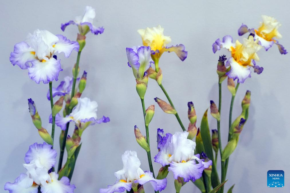 This photo taken on June 11, 2025 shows Irises displayed during the exhibition "Irises 2025" at Latvian Museum of Natural History in Riga, Latvia. The annual exhibition kicked off on Wednesday, and will run until Friday. Around 100 varieties of iris are exhibited, marking the 30th anniversary of iris exhibitions at the museum. (Photo by Edijs Palens/Xinhua)
