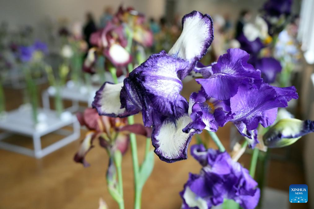 People visit the exhibition "Irises 2025" at Latvian Museum of Natural History in Riga, Latvia, June 11, 2025. The annual exhibition kicked off on Wednesday, and will run until Friday. Around 100 varieties of iris are exhibited, marking the 30th anniversary of iris exhibitions at the museum. (Photo by Edijs Palens/Xinhua)