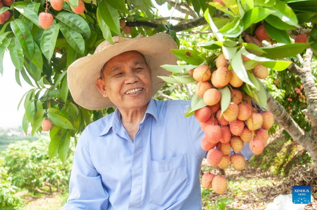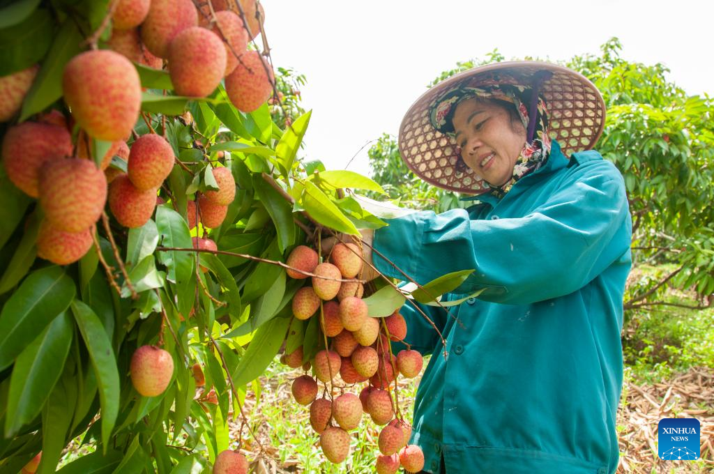 A local farmer harvests lychees in Bac Giang province, Vietnam, June 12, 2025. Lychees are now in season in Vietnam's Bac Giang Province, with the season typically lasting 10 to 15 days from early June. (Photo by Dang Hong Dung/Xinhua)