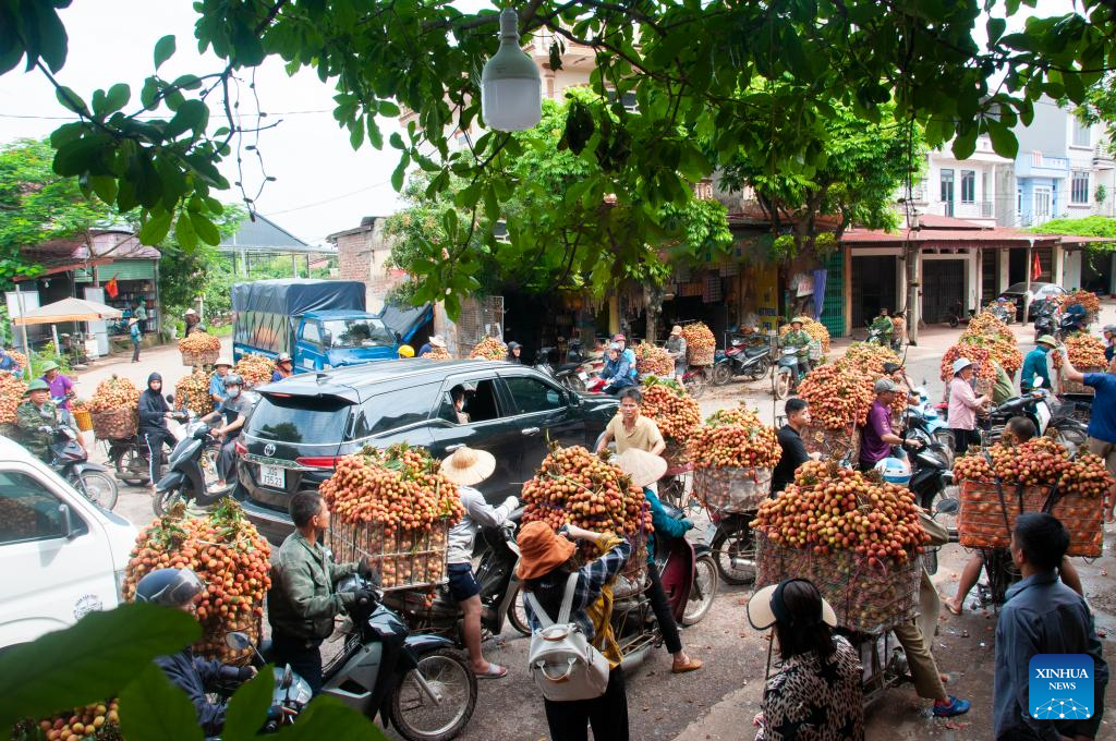 Local famers carry the newly harvested lychees in Bac Giang province, Vietnam, June 12, 2025. Lychees are now in season in Vietnam's Bac Giang Province, with the season typically lasting 10 to 15 days from early June. (Photo by Dang Hong Dung/Xinhua)