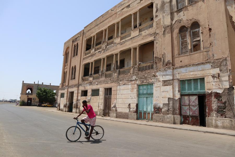 This photo taken on June 7, 2025, shows a man bicycling in the old quarters of Massawa, Eritrea. (Xinhua/Liu Fangqiang)