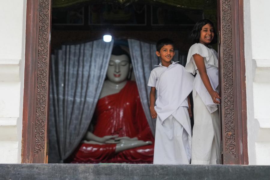Children are pictured at a Buddhist temple in Ratnapura, Sri Lanka on Poson Poya Day, June 10, 2025. (Photo by Thilina Kaluthotage/Xinhua)