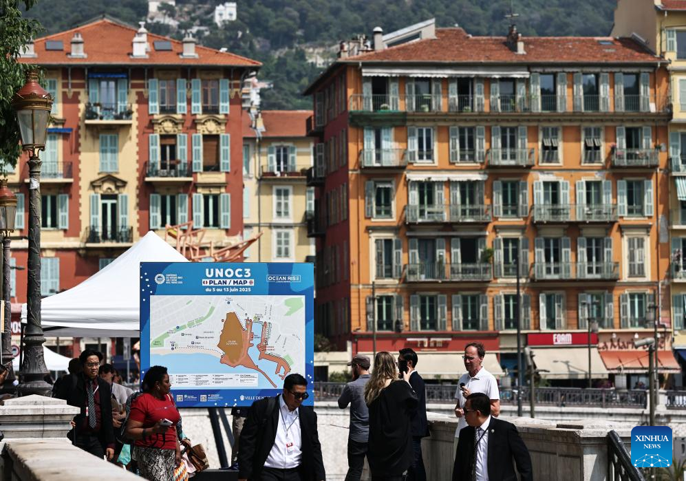 People walk by a sign bearing the venue map of the third United Nations Ocean Conference (UNOC3) on a street in Nice, France, June 10, 2025. The UNOC3 opened on Monday in Nice, a coastal city in southern France, under the theme of "Accelerating action and mobilizing all actors to conserve and sustainably use the ocean". (Xinhua/Gao Jing)
