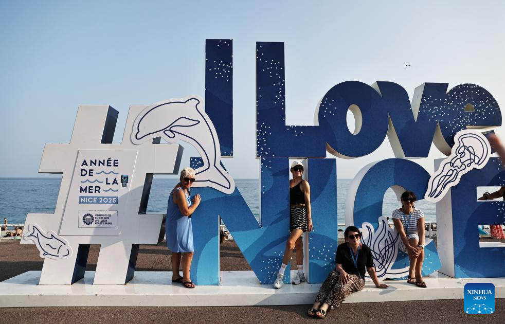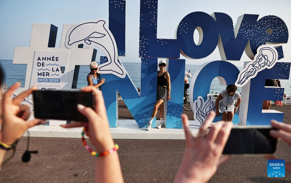 People take photos with an installation marking the third United Nations Ocean Conference (UNOC3) on the Promenade des Anglais in Nice, France, June 10, 2025. The UNOC3 opened on Monday in Nice, a coastal city in southern France, under the theme of "Accelerating action and mobilizing all actors to conserve and sustainably use the ocean". (Xinhua/Gao Jing)