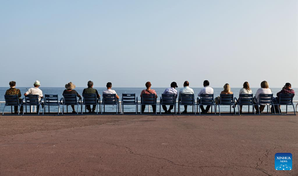 People sitting in the well noted blue chairs enjoy the sea view in Nice, France, June 10, 2025. The UNOC3 opened on Monday in Nice, a coastal city in southern France, under the theme of "Accelerating action and mobilizing all actors to conserve and sustainably use the ocean". (Xinhua/Gao Jing)