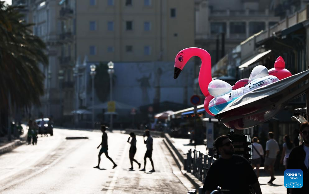 People walk on a street in Nice, France, June 10, 2025. The UNOC3 opened on Monday in Nice, a coastal city in southern France, under the theme of "Accelerating action and mobilizing all actors to conserve and sustainably use the ocean". (Xinhua/Gao Jing)