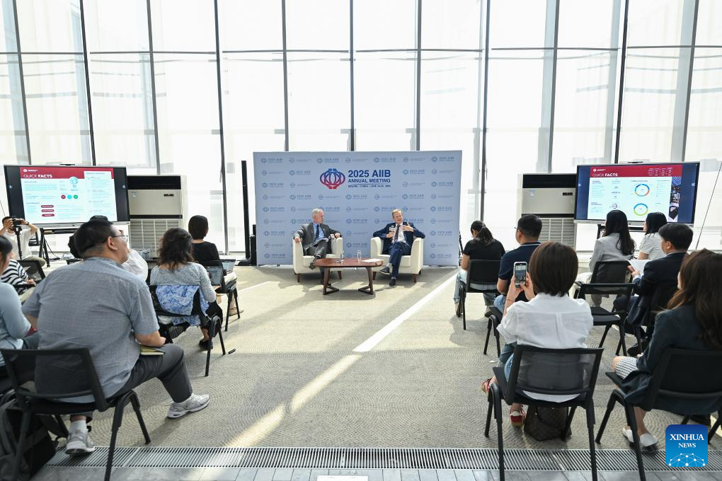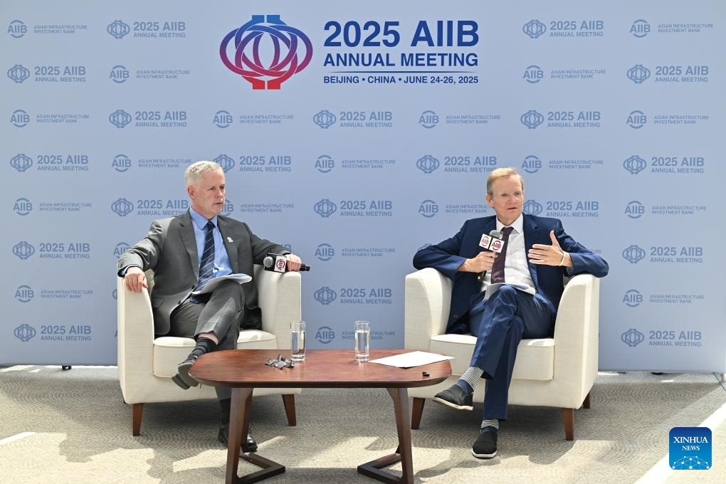 Ludger Schuknecht (R), vice president and corporate secretary of the Asian Infrastructure Investment Bank (AIIB), speaks during a press conference for the tenth annual meeting of AIIB in Beijing, capital of China, June 11, 2025. The tenth annual meeting of AIIB, which is expected to be participated by over 3,500 guests from about 100 countries and regions, will be held from June 24 to 26 in Beijing. China will be the host country of this event. (Xinhua/Li Xin)
