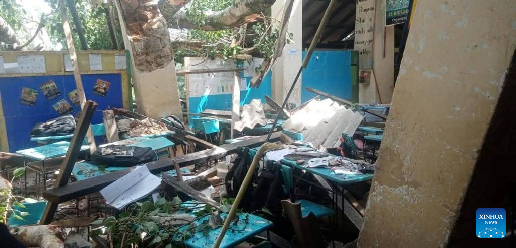 This photo taken on June 12, 2025 shows the incident site where a tree fell onto a school building in Balangoda, Sri Lanka. A student was killed and 17 others were injured after a tree fell onto a school building in Balangoda in Sri Lanka's Sabaragamuwa Province on Thursday, police reported. The deceased student was 17 years old, and the injured students have been hospitalized for treatment, according to police. Local police were conducting further investigations into the incident. (Xinhua)