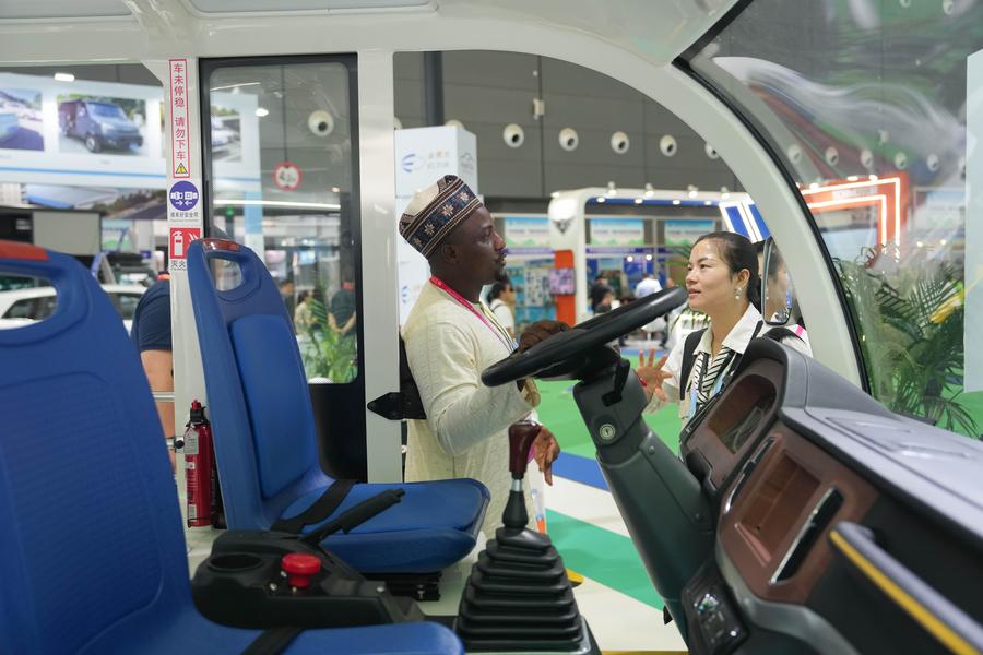 An exhibitor introduces a sightseeing vehicle to a visitor at Changsha International Convention and Exhibition Center in Changsha, central China's Hunan Province, June 12, 2025. (Xinhua/Xue Yuge)