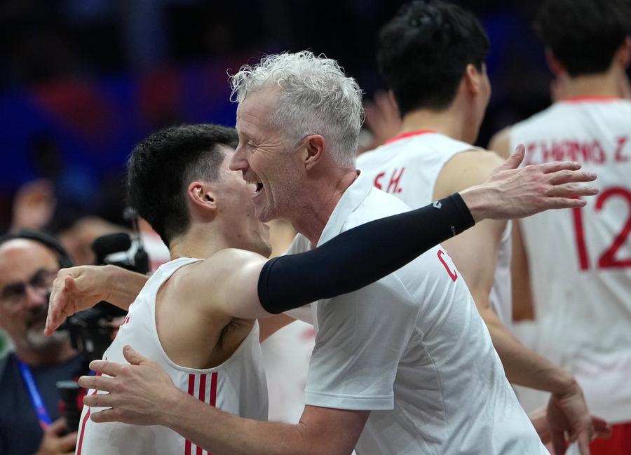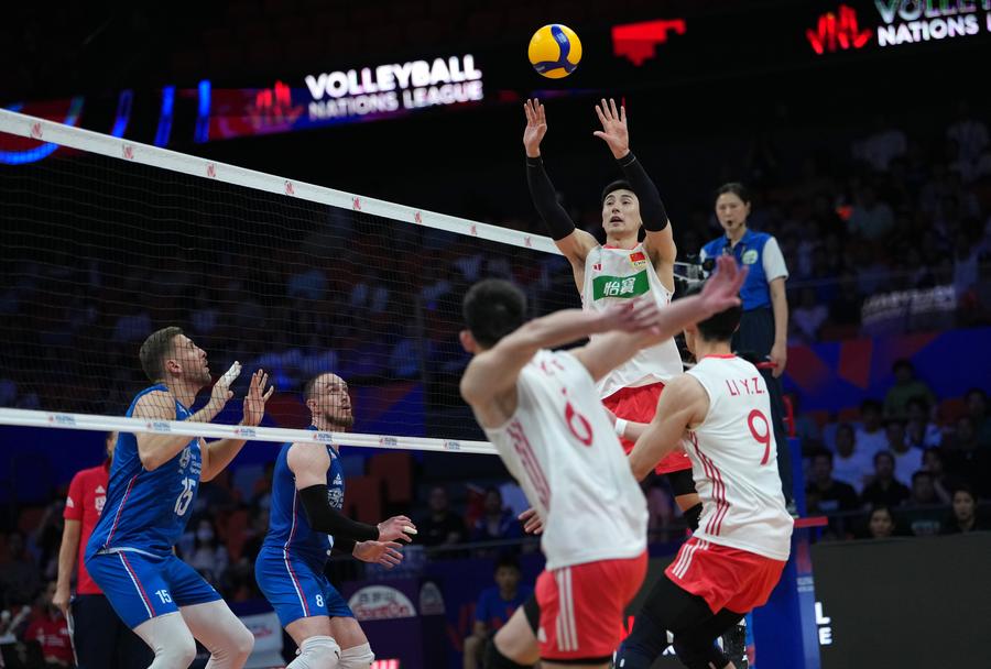 XI'AN, June 12 (Xinhua) -- World 24th-ranked China celebrated its head coach Vital Heynen's 56th birthday by breaking the curse to defeat Serbia in straight sets at the Volleyball Nations League (VNL) Xi'an leg on Thursday.