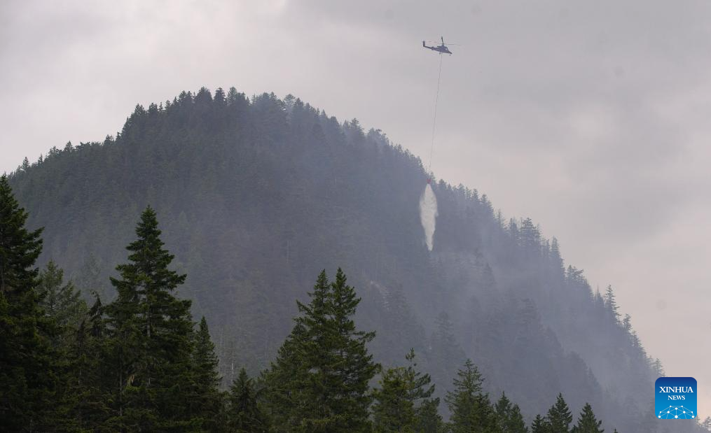 A helicopter drops water on the wildfire in Squamish, British Columbia, Canada, on June 12, 2025. Wildfire in Squamish has spread to 54 hectares in size, prompting an evacuation of the nearby area, according to BC Wildfire Service on Thursday. (Photo by Harrison Ha/Xinhua)