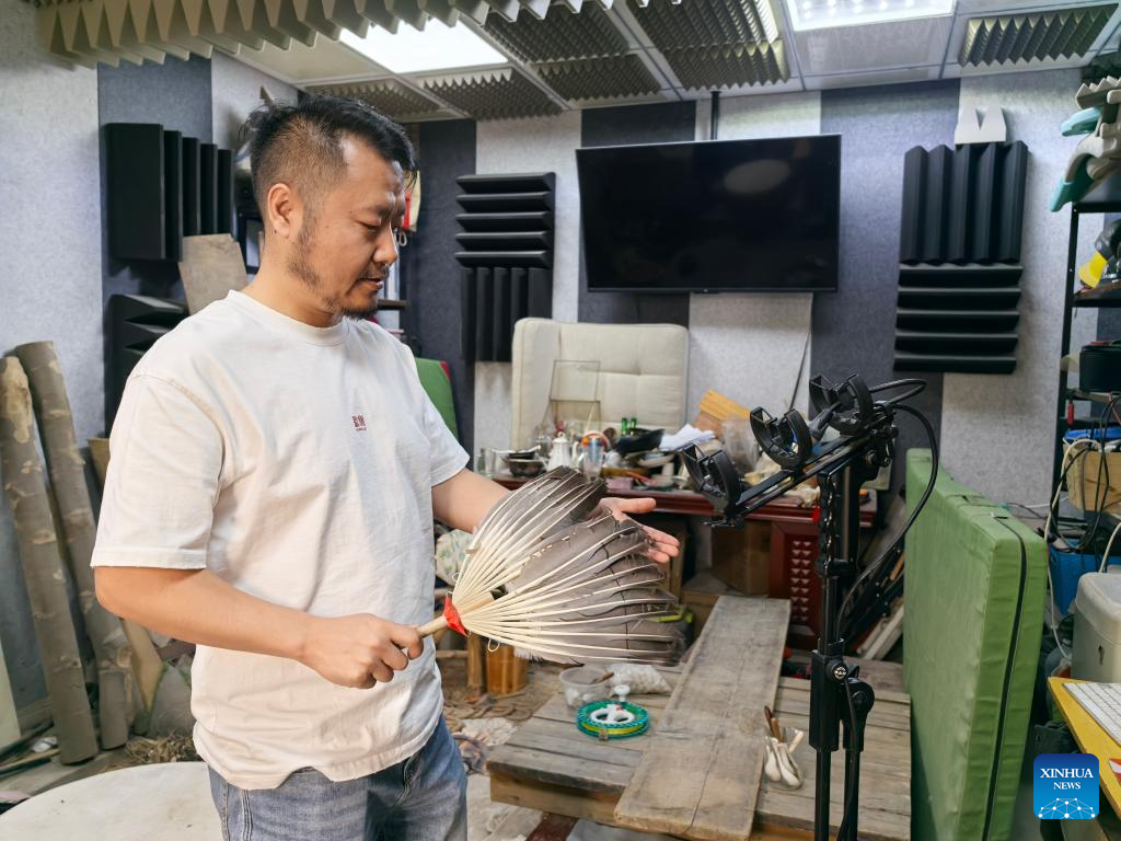 Foley artist Han Ruida brushes a feather fan against his palm to simulate the fluttering of birds in flight at the prop room of his studio in Qingdao, east China's Shandong Province, June 4, 2025. In 2017, Qingdao earned the title of UNESCO City of Film, becoming the first city in China to receive the honor. Since then, with major productions like "The Wandering Earth" filmed there, China's domestic film industry has taken significant strides toward industrialization. The roles within the industry have grown increasingly specialized, and foley artists, once seen as technical support, are now expected to think like directors and screenwriters, using sound to deepen storytelling and enrich the cinematic experience. (Xinhua/Zhang Liyuan)
