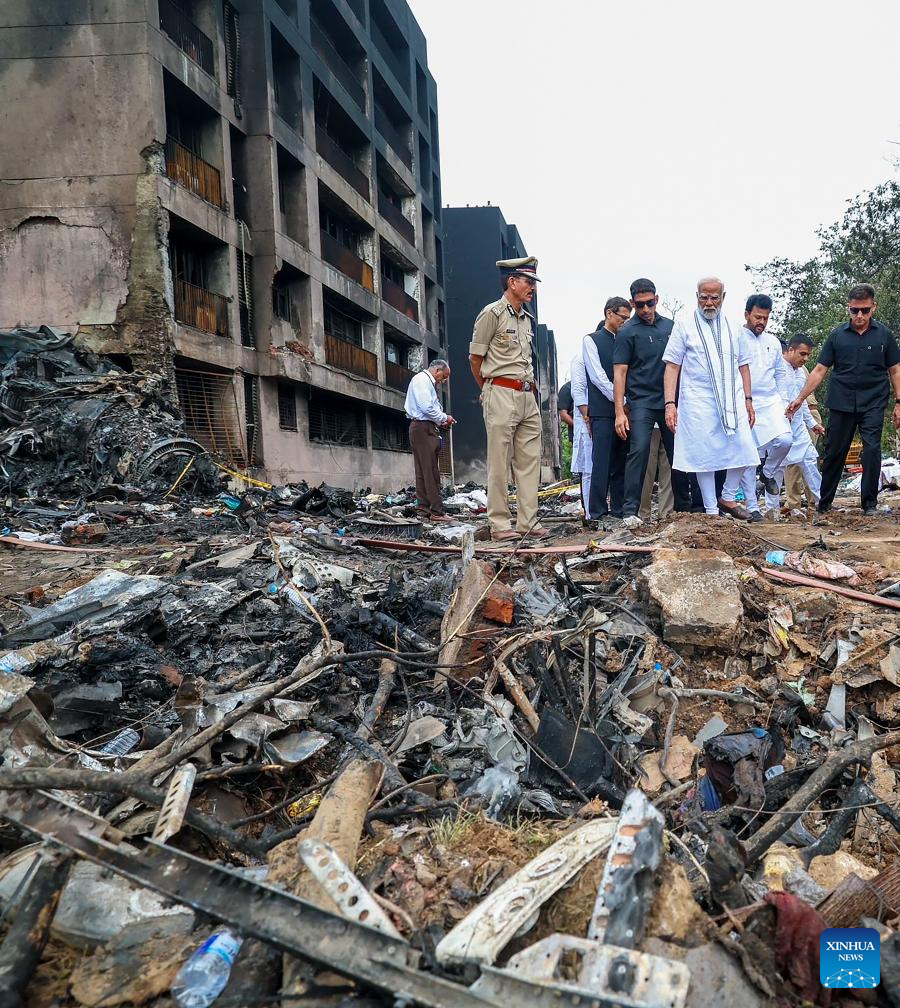 Indian Prime Minister Narendra Modi visits the site of Air India plane crash incident in Ahmedabad, India's western state of Gujarat, June 13, 2025. The Indian government has launched a formal investigation into Thursday's tragic Air India plane crash, confirmed the country's Civil Aviation Minister Ram Mohan Naidu in a social media post. According to the latest media reports, a total of 265 dead bodies had already been brought to a local government hospital in Ahmedabad city, where the plane crash had taken place. (IANS/PMO/Handout via Xinhua)